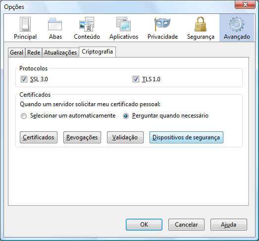 Selecionar a aba "Avançado", depois a sub-aba "Criptografia" e clicar no botão "Dispositivos de Segurança".