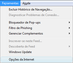 Clicar no menu "Ferramentas" e selecionar "Opções da Internet".