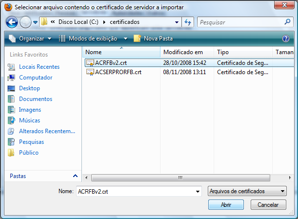 Os itens 3 e 4 devem ser feitos para o certificado ACRFBv2.crt e ACSERPRORFB.crt.