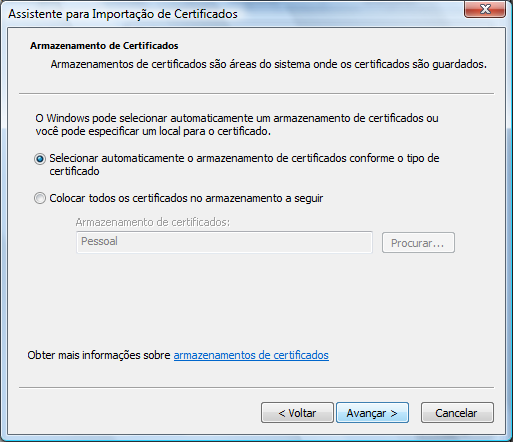 Selecionar o item "Selecionar automaticamente o armazenamento de certificados conforme o tipo de certificado" e clicar no botão "Avançar".