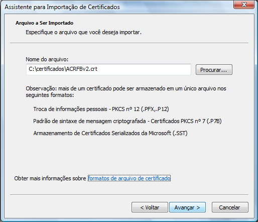 Os itens do 3 ao 9 devem ser feitos para o certificado ACRFBv2.crt e ACSERPRORFB.crt.